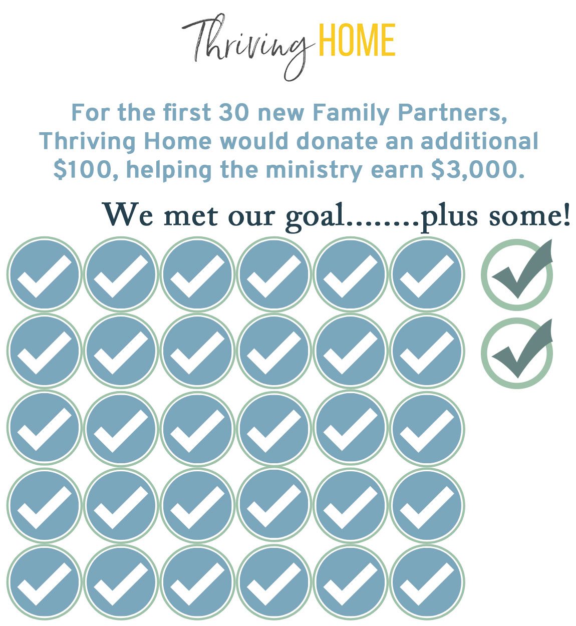 We are excited to share that with the help of Thriving Home, 32 new supporters joined the Family Partners in honor of our 30th anniversary.